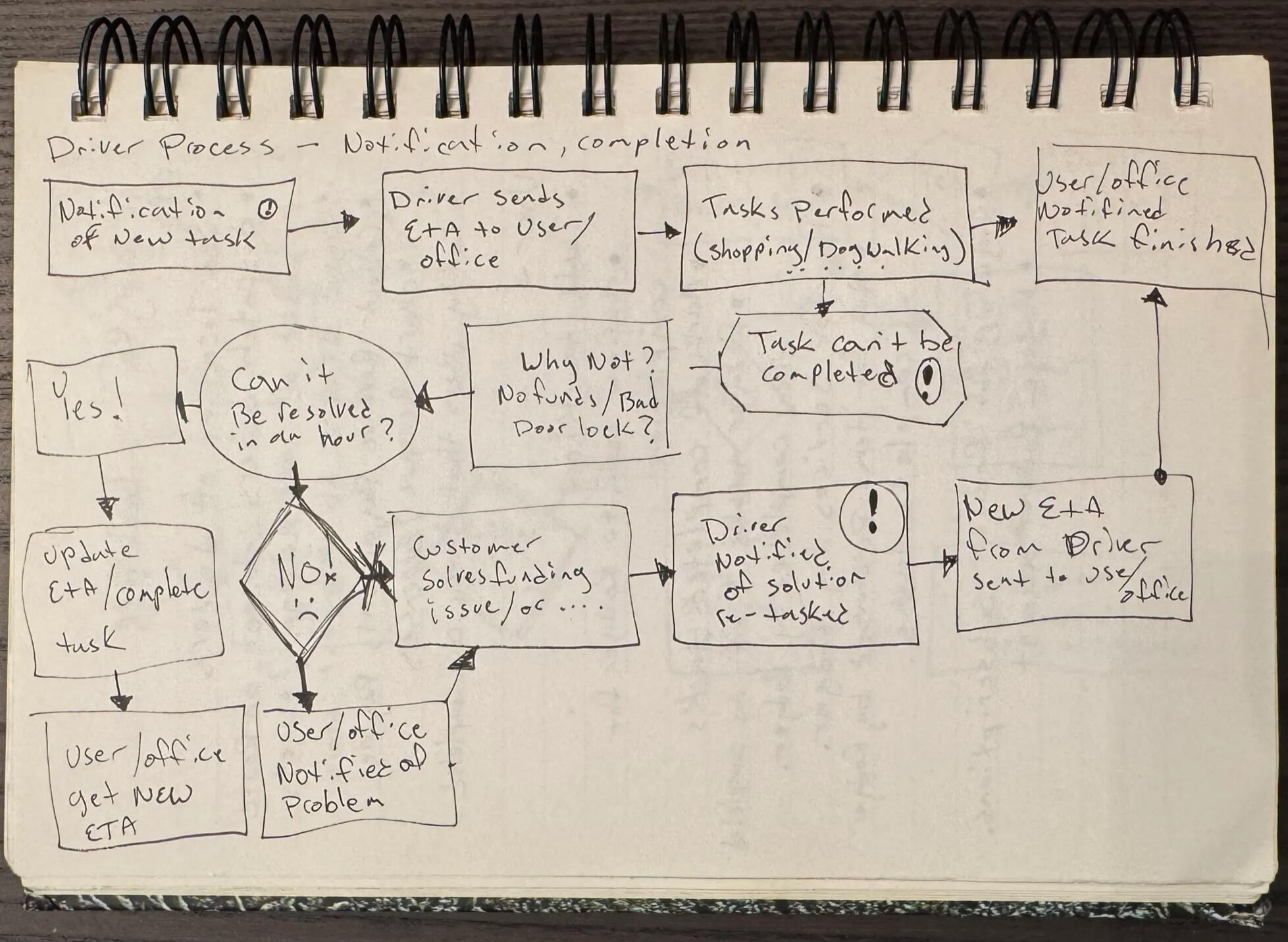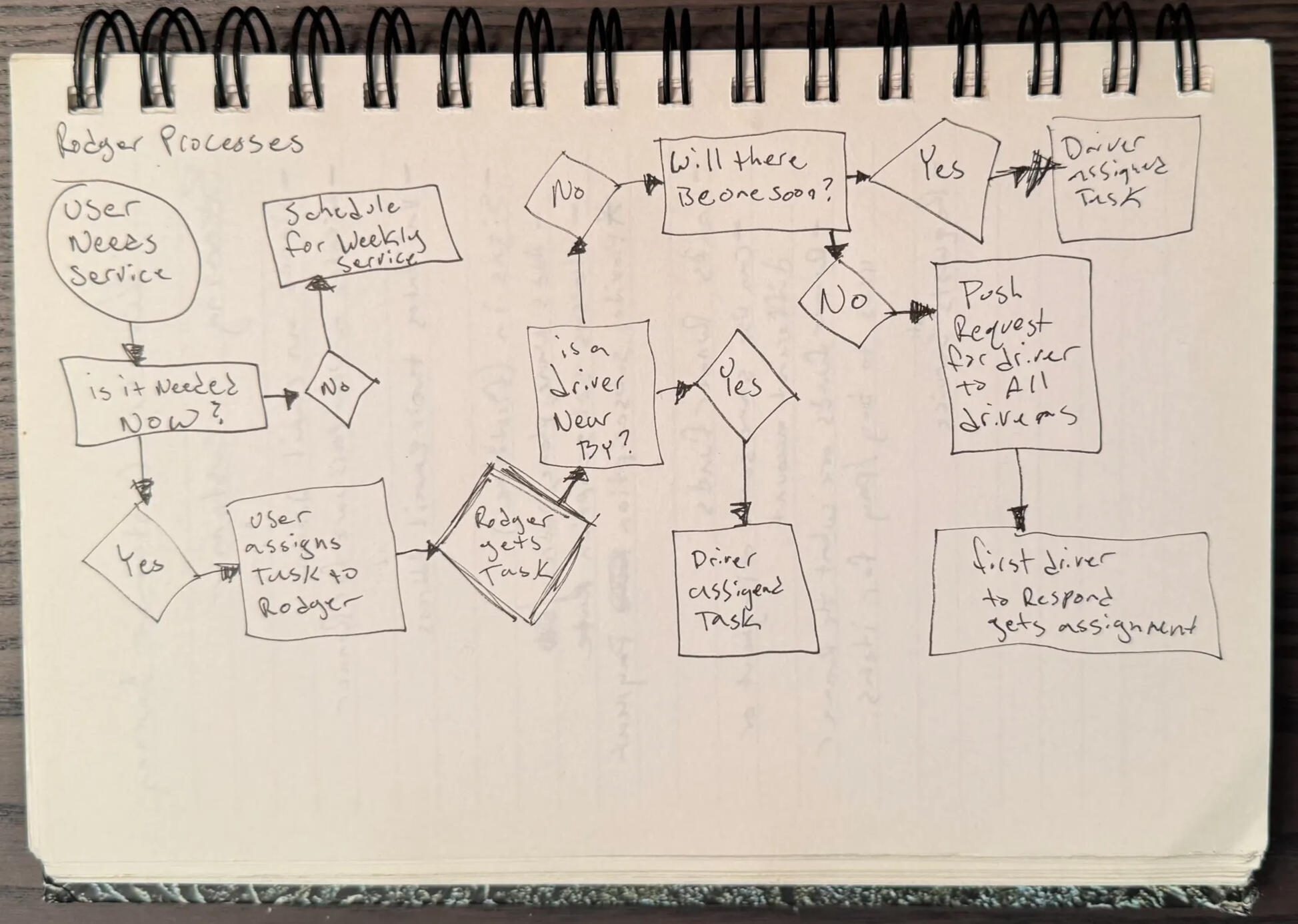 Rather than starting with screens, I mapped the underlying service logic first: how requests move through the system, how roles interact, and how breakdowns are handled when real-world conditions disrupt ideal flows.Rodger was designed years before gig work became app-based, exploring how a dispatch and task-tracking system could scale without losing clarity, accountability, or human judgment.Rodger models the same coordination, permissioning, and failure-state challenges found in enterprise operations dashboards and internal tooling.The result was a role-aware dispatch model built around communication, clear handoffs, and decision support rather than blind automation.